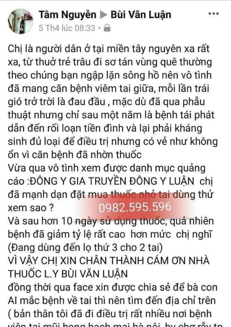 Chị Tâm (45 tuổi, Tiền Giang) đã từng rất vất vã để tìm định hướng điều trị bệnh viêm tai giữa của mình. Do làm nghề đi ghe hàng, thường xuyên phải dầm mình trong nước nên tai chị bị chảy mủ, đọng ráy và gây ngứa ngáy, ù tai thường xuyên. Chị đã trải qua khám chữa nhiều nơi các chuyên khoa tai mũi họng nhưng tình hình không cải thiện. Trong một lần tìm tòi trên mạng chị nhìn thấy địa chỉ của lương y Bùi Văn Luận. “Chỉ với một bức ảnh về tình trạng bệnh và miêu tả vết lở, lương y đã gửi cho tôi thuốc, sau 4 lần nhỏ giọt vào vết thương theo đúng liều lượng, lỗ tai khô liền lại và kết vảy. Bây giờ tình trạng tai rất tốt, không bị ù tai và ra mủ nữa.”